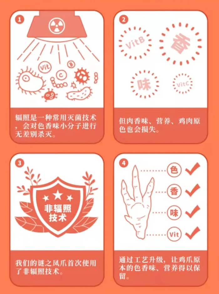 谜汁凤爪首创四川省农业科技认证的“非辐照锁鲜技术”,十年技术沉淀,锁住鸡爪的色香味,在舌尖呈现鲜美丰富的世界口味。