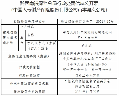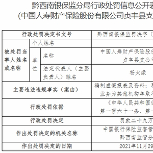 国寿财险贞丰县支公司违法被罚 编制虚假报表及资料等