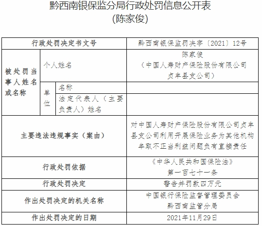 陈家俊对中国人寿财产保险股份有限公司贞丰县支公司利用开展保险业务为其他机构牟取不正当利益问题负有直接责任。根据《中华人民共和国保险法》第一百七十一条,中国银行保险监督管理委员会黔西南监管分局对其警告并罚款四万元。