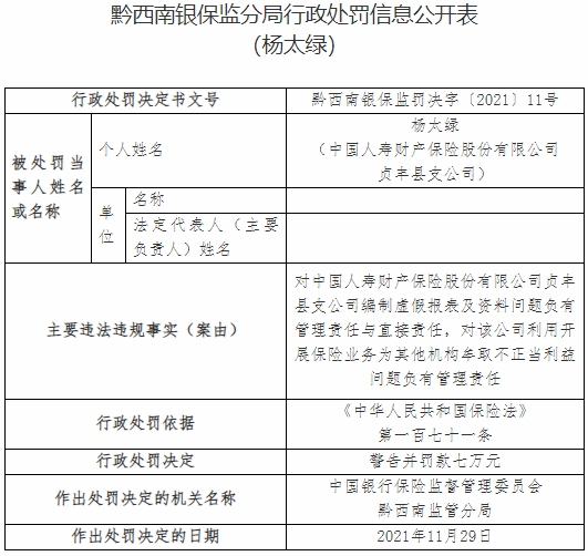 杨太绿对中国人寿财产保险股份有限公司贞丰县支公司编制虚假报表及资料问题负有管理责任与直接责任,对该公司利用开展保险业务为其他机构牟取不正当利益问题负有管理责任。根据《中华人民共和国保险法》第一百七十一条,中国银行保险监督管理委员会黔西南监管分局对其警告并罚款七万元。