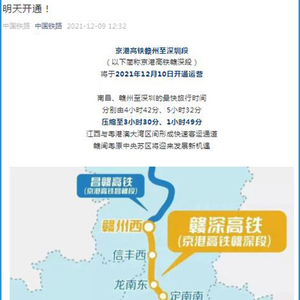 中工网讯 据中国铁路微信公众号消息,京港高铁赣州至深圳段(以下简称京港高铁赣深段)将于2021年12月10日开通运营。南昌、赣州至深圳的最快旅行时间分别由4小时42分、5小时32分压缩至3小时30分、1小时49分,江西与粤港澳大湾区间形成快速客运通道,赣闽粤原中央苏区将迎来发展新机遇。