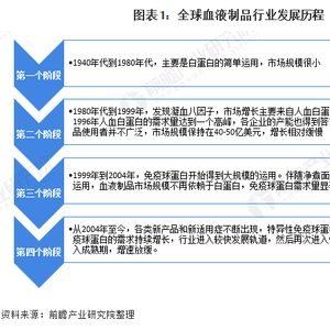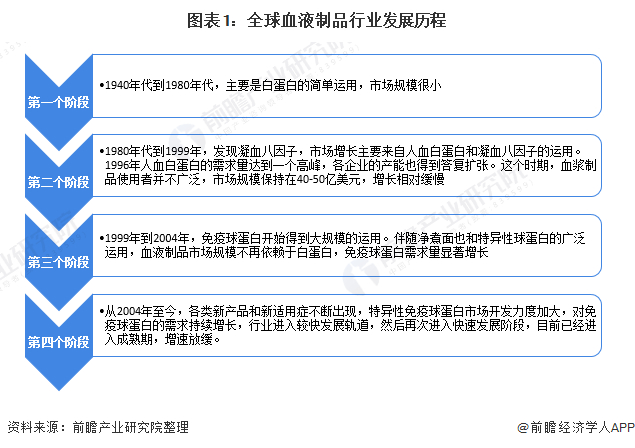 全球血制品经历了从产品供不应求、无暇扩张导致安全问题后政府出面整顿,然后再次进入快速发展阶段,目前已经进入成熟期,增速放缓。从产品主线来看,全球血液制品行业的发展主要有4个阶段: