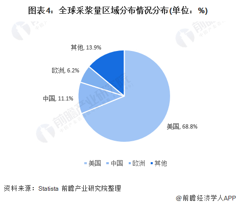 从全球采浆量区域分布来看,美国采浆量居全球首位,采浆量占全球比重约为68.8%;中国采浆量居全球第二占比约为11.1%;欧洲采浆量排名第三,采浆量占全球比重为6.2%左右。
