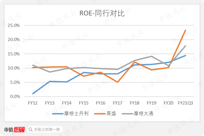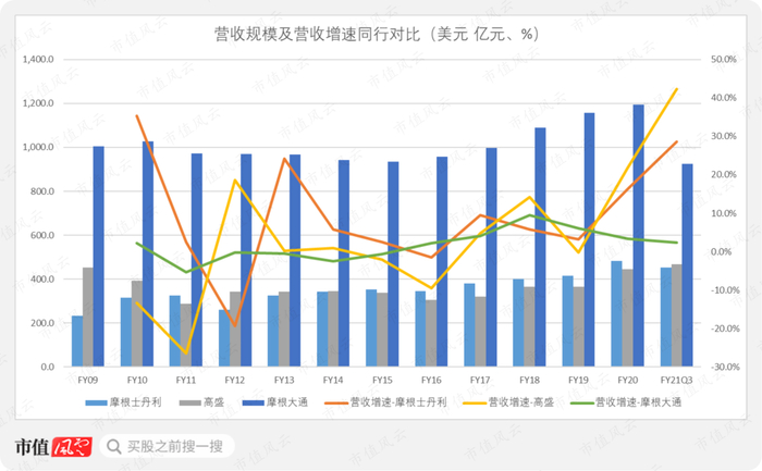 另外值得一提的是,在2018年、2020年和2021年前三季度,摩根士丹利的营收增速都不及高盛。