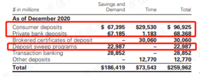 而Deposit sweep program(与摩根士丹利的Brokerage sweep deposits一个意思)中的存款仅为229.9亿美元,占比仅为8.8%。
