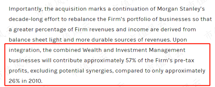 另外,摩根士丹利还在公告中表示,预计合并后的财富管理和投资管理业务将贡献公司约57%的税前利润,这一比例在2010年仅为26%。