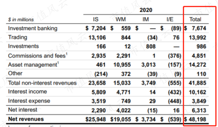 比如说,2020年公司投行业务贡献营收76.7亿美元,占比达15.9%;净利息收入为63.1亿美元,占比为13.1%。