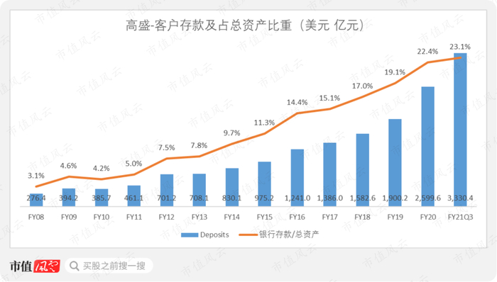 高盛是希望借助客户存款的快速增长,来达到财富转型的目的。