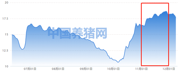 从生猪价格走势来看,11月是半年来生猪平均价格最高的月份,猪粮比价长期保持在6:1以上,可谓下半年的“小高潮”,部分企业进入盈利区间。