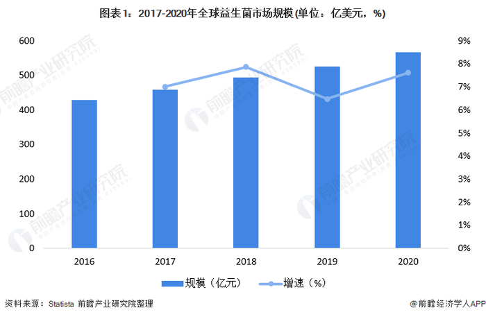 根据Statista的数据显示,2016-2020年全球益生菌行业的市场规模呈现逐年增长的状态。2016年全球益生菌的市场规模为428亿美元,到2020年全球益生菌的市场规模增长至566亿美元,同比上年增长7.6%。