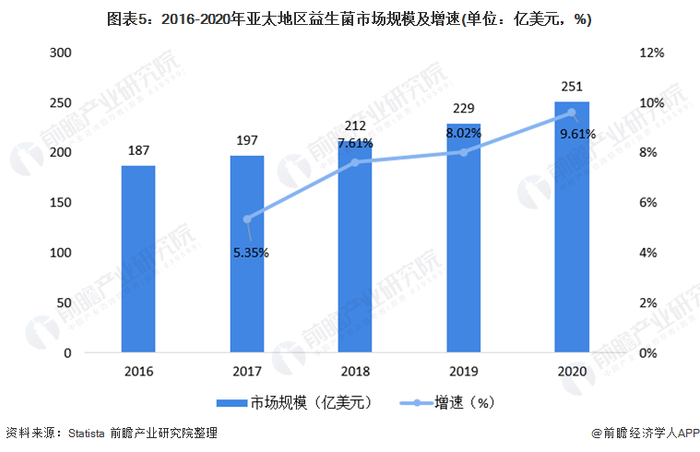2016-2020年,亚太地区益生菌市场规模呈现出逐年增长的趋势,2020年亚太地区益生菌市场规模达到251亿美元,同比上年增速为9.6%。