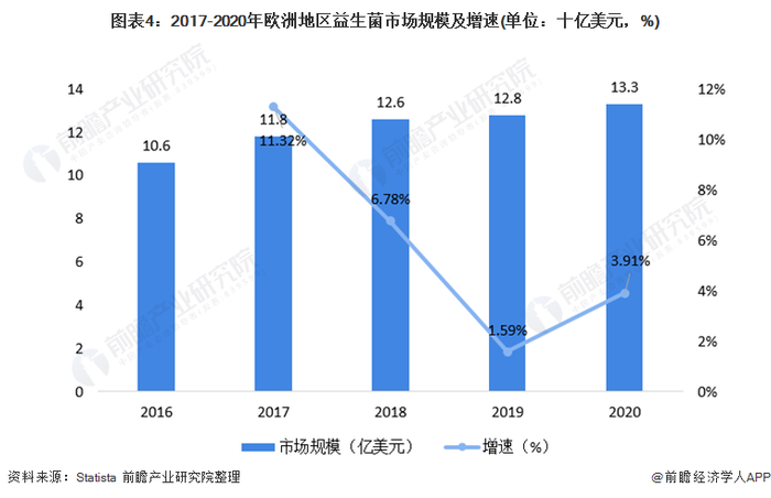2017-2020年欧洲益生菌市场的发展虽然呈现逐年扩大的情况,但是增长率呈现快速下降的趋势,但是在2020年,受到了疫情的影响,益生菌产品开始被重视,增速有所上升。2020年欧洲益生菌市场规模为133亿美元,同比上年增长3.91%。