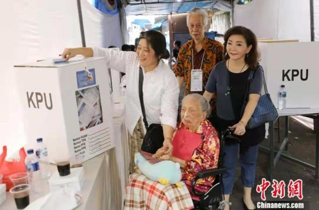 2019年4月17日,约1.92亿印尼选民在全国80万多个投票站投票选举新一届正、副总统、国会议员、省级议会议员、县级议会议员和地方代表理事会成员。图为105岁的华人大妈刘甘娘(前)在家人帮助下完成投票。中新社记者 林永传 摄