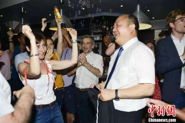 2017年6月,法国议会选举中,巴黎市议员、巴黎十三区副区长陈文雄在巴黎第九选区胜选,成为法国本土首位华裔国民议会议员。图为助选团队和支持者为陈文雄(右)举行庆祝活动。中新社记者 龙剑武 摄