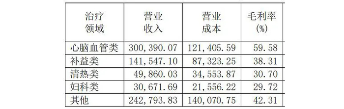 2020年,安宫牛黄丸代表的心脑血管类,是绝对的赚钱主力,贡献了30亿元,占到其医药工业板块的4成营收,毛利率也是最高的,为59.58%,贡献了约18亿的毛利。