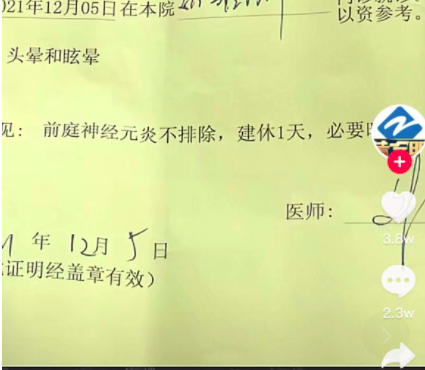 据医院的门诊病历显示,医生意见是前庭神经元炎不排除,建议休息一天,必要时住院治疗。