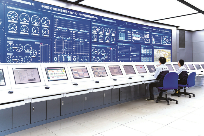 站在中国巨石智能控制中心里,占据一整面墙的大屏幕上,分门别类对年产15万吨的玻璃纤维生产线进行数字化、可视化的全流程监控。