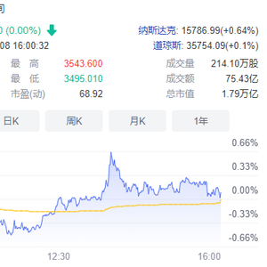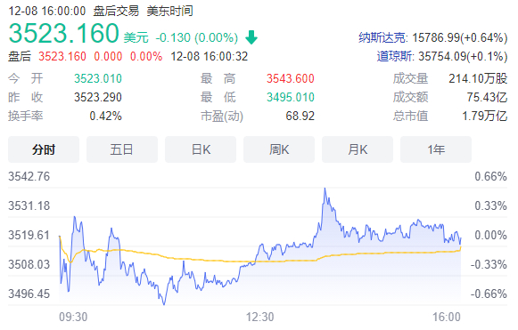 截至当地时间12月8日收盘,亚马逊股价报收3523.16美元,与前一日基本持平,总市值1.79万亿美元。