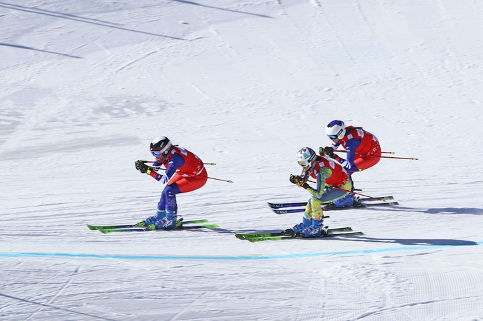 障碍追逐(Ski Cross)是自由式滑雪中唯一的竞速类项目,也是一项极富观赏性和不可预料性的项目。选手四人一组出发,经过“搓衣板”、连续弯道、波浪道、跳台等一系列复杂多变的地形,比拼谁先到达终点,每组前两名进入下一轮,后两名被淘汰。为了抢占领先位置和最佳滑行路线,选手间不可避免地会产生身体接触,但如果是故意干扰其他运动员,就属于犯规,会被取消比赛资格。
