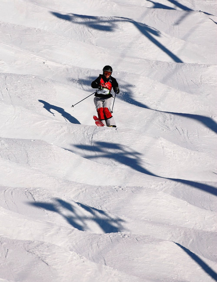 雪上技巧比赛场地一般建在陡峭的斜坡上,由许多雪丘组成的陡坡线路构成。 视觉中国 图