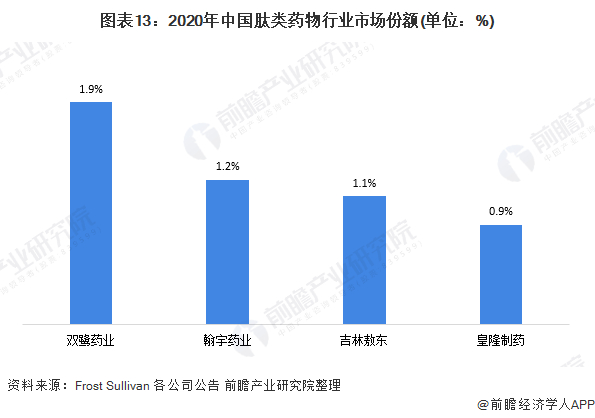 根据Frost&Sullivan的数据,2020年,我国肽类药物市场规模约为85亿美元。依据各公司企业年报所公布的数据对肽类药物行业市场份额进行测算分析,分析结果如下:2020年,双鹭药业的市场份额达到了1.91%;其次是翰宇药业,达到了1.25%;再者是吉林敖东,达到了1.1%。