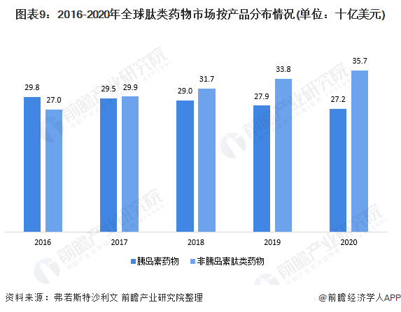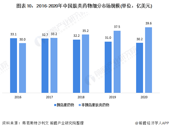 在此背景下,前瞻根据我国肽类药物市场规模在全球范围的比重测算出在我国肽类药物中,胰岛素药物的市场规模从2016年的33.1亿美元波动下跌至2020年的30.2亿美元;而非胰岛素肽类药物从2016年的30亿美元上升至2020年的39.6亿美元。