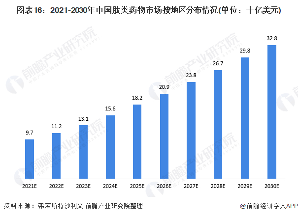 近年来,我国医药行业稳健发展;而我国肽类药物市场于2020年仅占全球肽类药物市场的13.6%,但已经以持续高于美国及欧洲市场的速度增长。预计中国的肽类药物市场由2020年的85亿美元增至2025年的182亿美元,复合年增长率为16.3%,并进一步增至2030年的328亿美元,2025年至2030年的复合年增长率为12.5%。