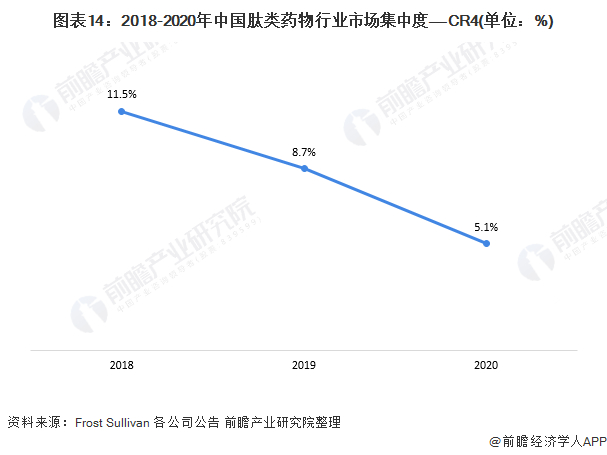 从市场集中度发展趋势看,近年来我国肽类药物行业集中度呈现下跌态势。随着我国肽类药物在全治疗领域的广泛应用,我国胸腺五肽等品种迎来激烈厮杀,市场集中度进一步下跌;从2018年的11.5%下跌至2020年的5.1%。