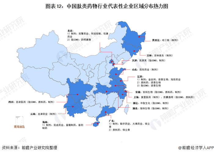 从代表性企业区域分布看,江苏省主要由金斯利、诺泰生物、海辰药业为主;广东省主要以翰宇药业、大佛药业、信立泰等企业为主;北京市主要以双鹭药业、华润双鹤、悦康药业为主。