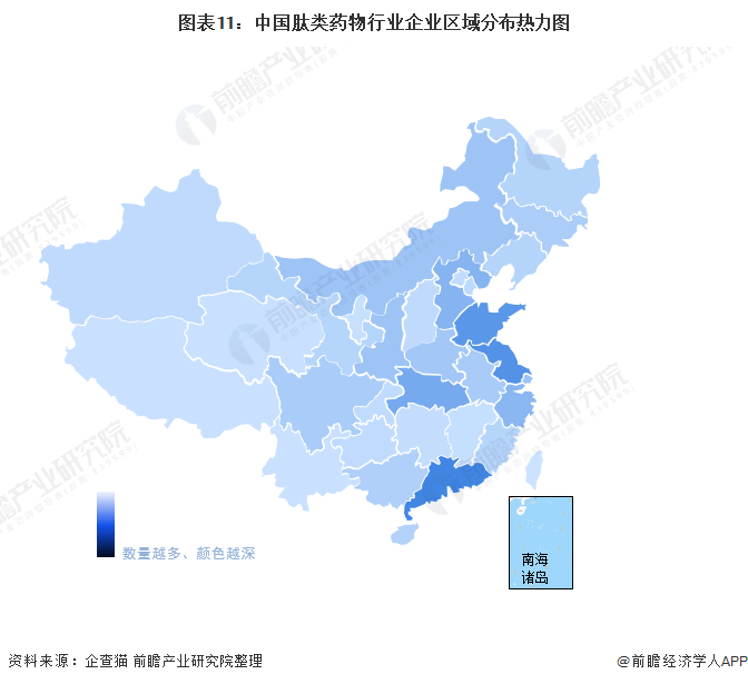 在企查猫平台以“肽类药物”为关键词进行检索,数据显示,我国肽类药物行业生产企业数量一般,但大在企查猫平台以“肽类药物”为关键词进行检索,数据显示,我国肽类药物行业生产企业数量一般,但大部分企业规模较小。通过对企业所在地进行汇总可知,我国广东省、山东省、江苏省肽类药物生产企业相对较多。整体来看,我国肽类药物生产企业区域分布相对集中。