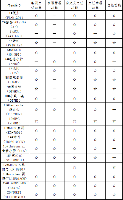 结果表明,20款样品全部具备自定义烹饪功能,即用户可以自行设置烹饪的时间、温度、火力档位等参数。17款机型具备智能烹饪和烹饪助理功能,能够根据食谱或者加入的食材量自动调整工作参数,一键完成烹饪,且可以通过语音、图文等形式帮助用户完成烹饪。仅10款机型具有食谱管理功能,剩余的样品无法根据用户自身的喜好在设备或者软件上添加、删除食谱。