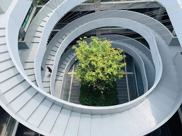 整个建筑被绿色包裹着,台地式平台、屋顶以及从杨树浦路蜿蜒而上的山坡上,满是绿化与花卉。这是一座立体通透的城市公园。