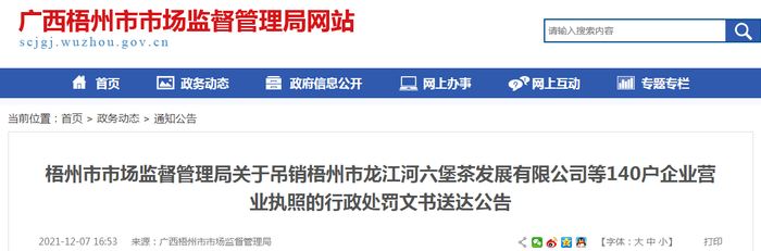 梧州市市场监督管理局关于吊销梧州市龙江河六堡茶发展有限公司等140户企业营业执照的行政处罚文书送达公告