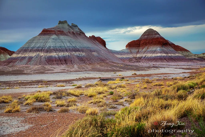掩埋古代森林的可能是一次泥石流或者一次火山喷发,后续经过数亿年的沉积,再因地质抬升,被风和水流侵蚀重新暴露在地表,同样的作用也形成了彩虹般的地层结构,日落和傍晚的风暴给彩虹般的地层更披上了变化莫测的色彩 | 钟蜀黍