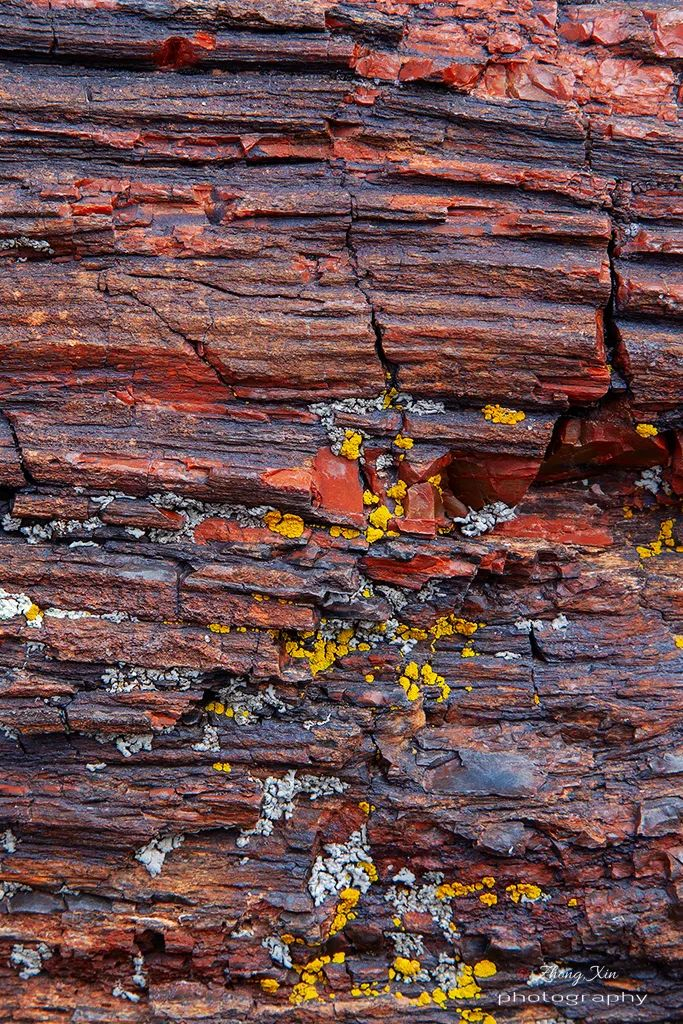 这些硅化木上常覆盖着明黄色的地衣,这些地衣会分泌一些有机酸如草酸,可以更强烈地侵蚀岩石——这片森林最后的遗迹也将无法逃脱风化作用,成为土壤,最终回归于地球的物质循环之中 | 钟蜀黍