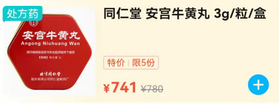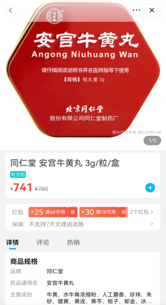 同时,记者在电商外卖平台也进行了查询,发现益丰大药房的安宫牛黄丸价格依旧为760元(有平台红包折扣所以显示价格为741元)。