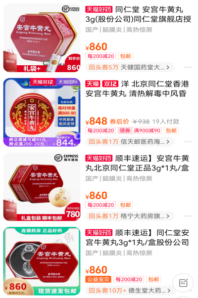 除了同仁堂的海外旗舰店,其他电商平台价格已经调整,基本都在860元/丸。