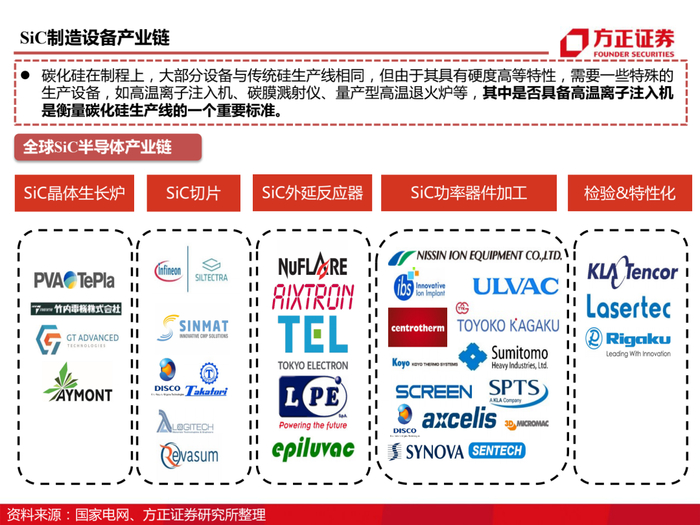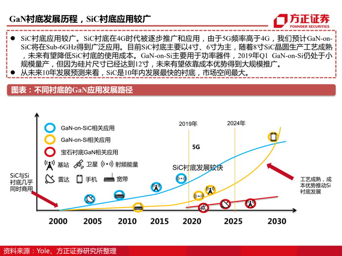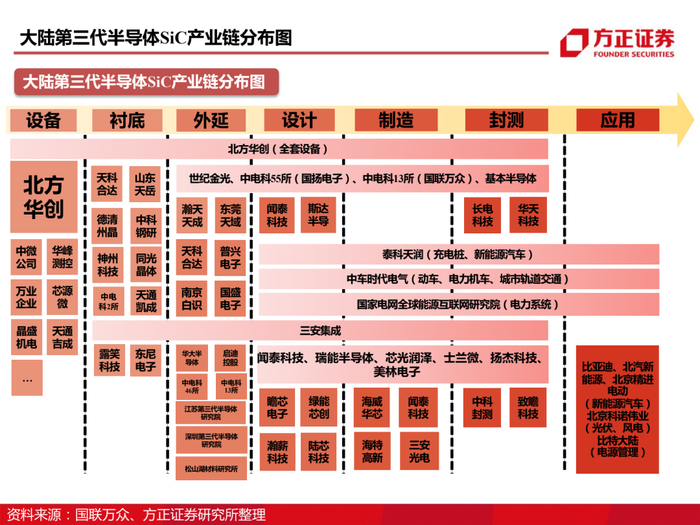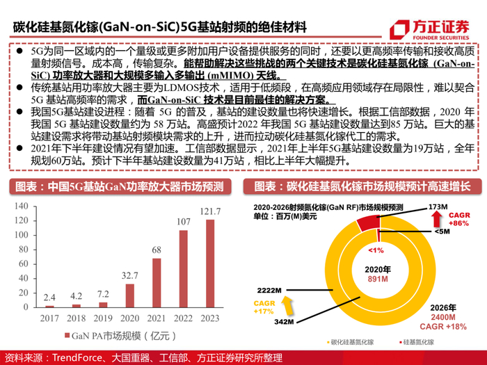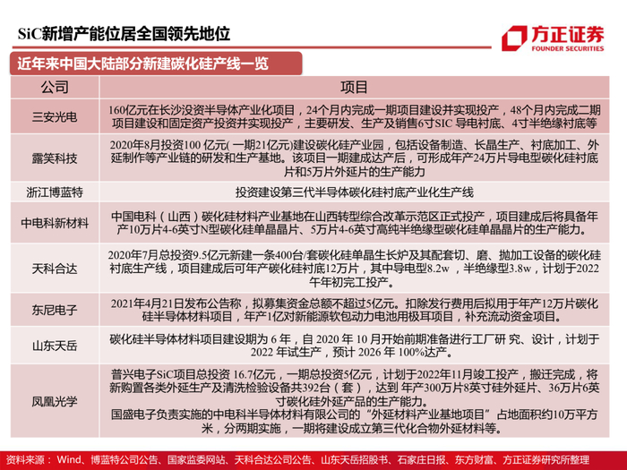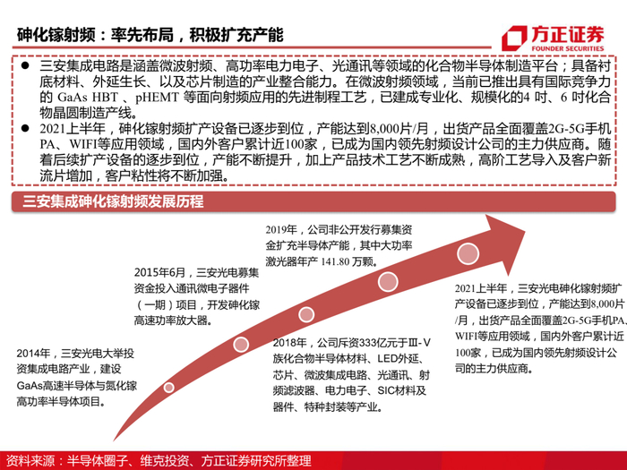 公司抢先布局化合物半导体,拥有从衬底到器件的全链条布局。三安光电2014年即设立全资子公司三安集成,三安集成作为国内首家基于6英寸晶圆的化合物半导体晶圆代工厂,从基于砷化镓材料的无线射频IC,到基于碳化硅、氮化镓材料的宽禁带功率半导体,再到基于砷化镓、磷化铟材料的激光光源和光探测芯片,三安集成均有相应的投入和规划;三安集成致力于成为世界级的化合物半导体研发、制造和服务平台,服务全球IDH和IDM。目前湖南项目一期已投产,预计年产SiC晶圆40万片/年;砷化镓射频扩产设备已逐步到位,产能达到8,000片/月。