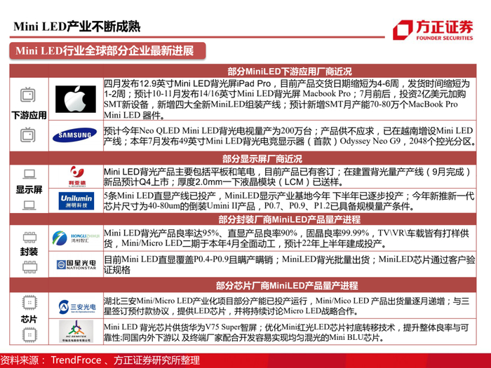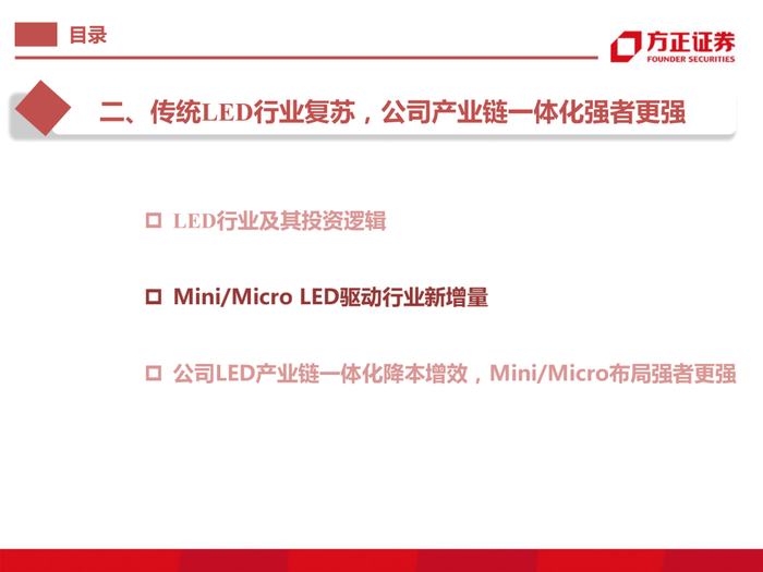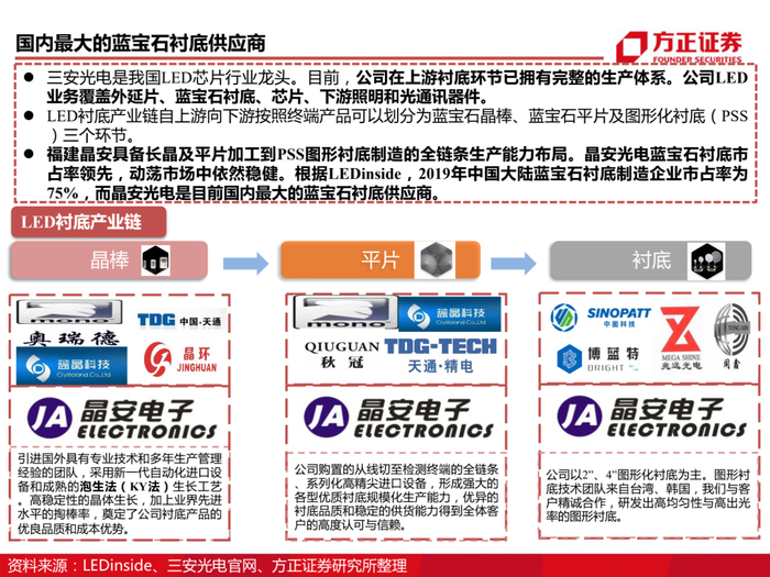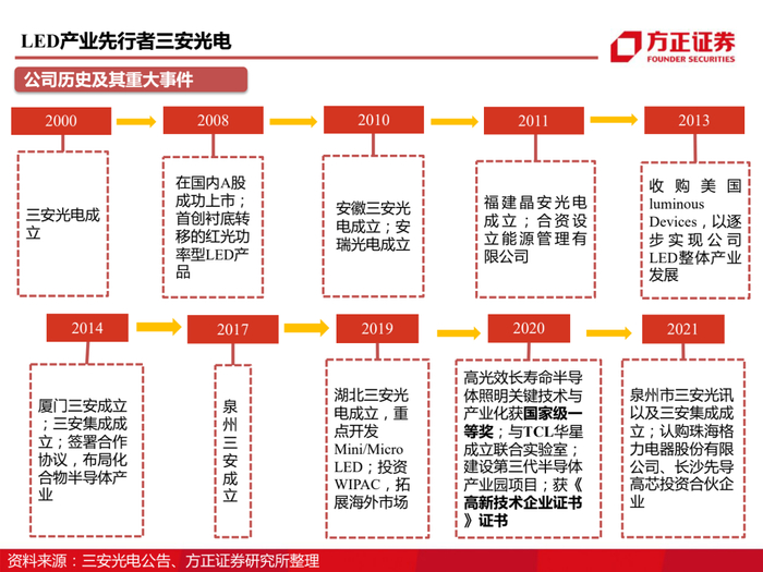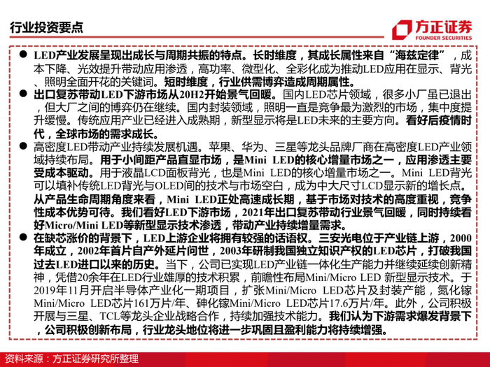 传统LED周期回暖叠加Mini LED产业爆发,公司作为业内龙头将显著受益。三安光电位于产业链上游,2000年成立,2002年首片自产外延片问世,2003年研制我国独立知识产权的LED芯片,打破我国过去LED进口以来的历史。当下,公司已实现LED产业链一体化生产能力并继续延续创新精神,凭借20余年在LED行业雄厚的技术积累,前瞻性布局Mini/Micro LED 新型显示技术。