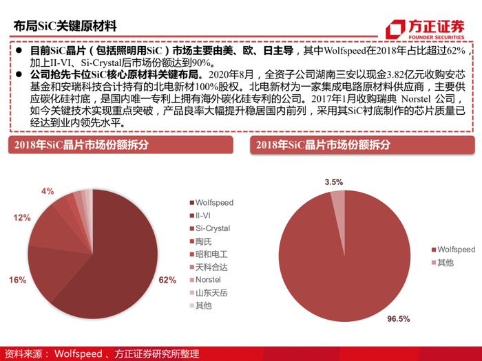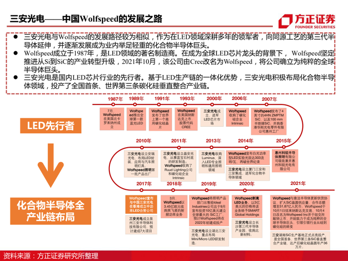 三安光电与Wolfspeed的发展路径较为相似,作为在LED领域深耕多年的领军者,向同源工艺的第三代半导体延伸,并逐渐发展成为业内举足轻重的化合物半导体巨头。