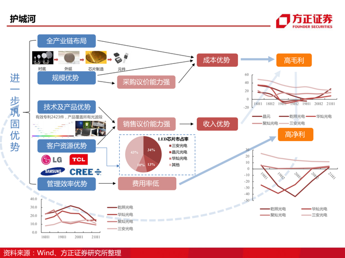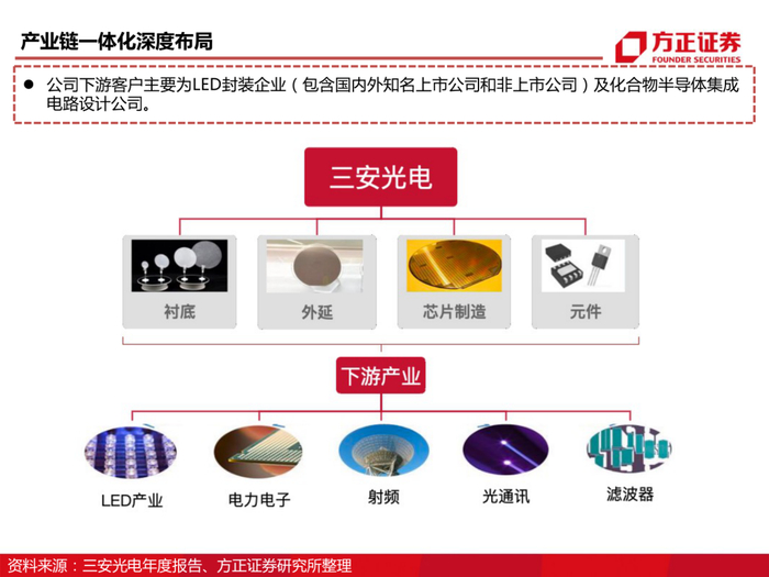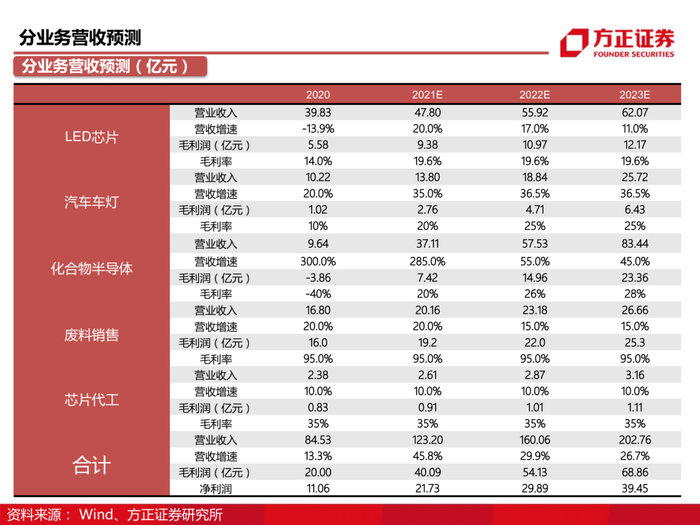 我们认为公司作为LED行业龙头,基于LED产业链一体化实现降本增效保证稳定营收。在此基础上,公司积极布局第三代半导体,建设产线的同时与下游TCL、三星等企业战略合作,现已实现微波射频、光电、电力电子、光通讯四大领域的细分产品供应。未来,在下游需求高景气度的背景下,待公司产能不断释放,将持续驱动公司营收规模增长。