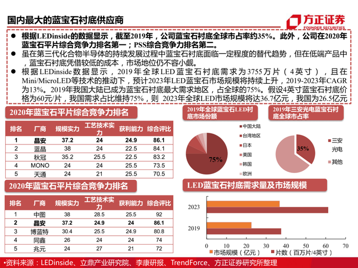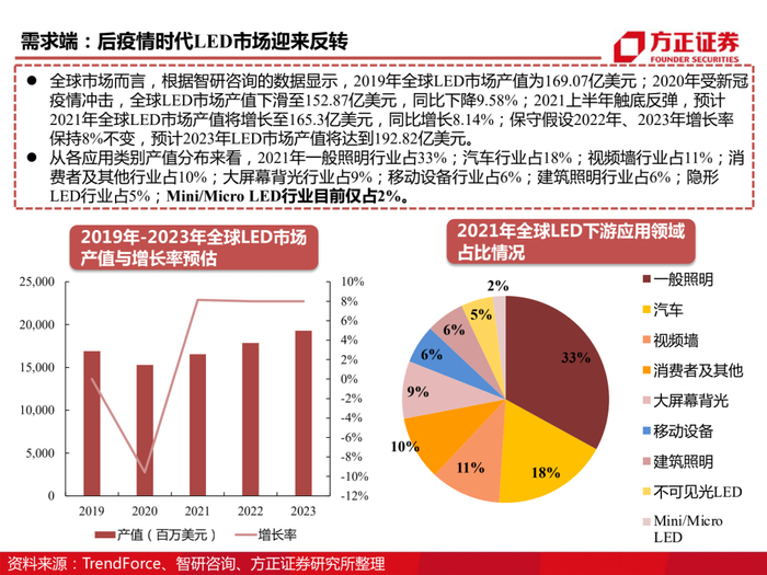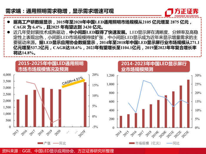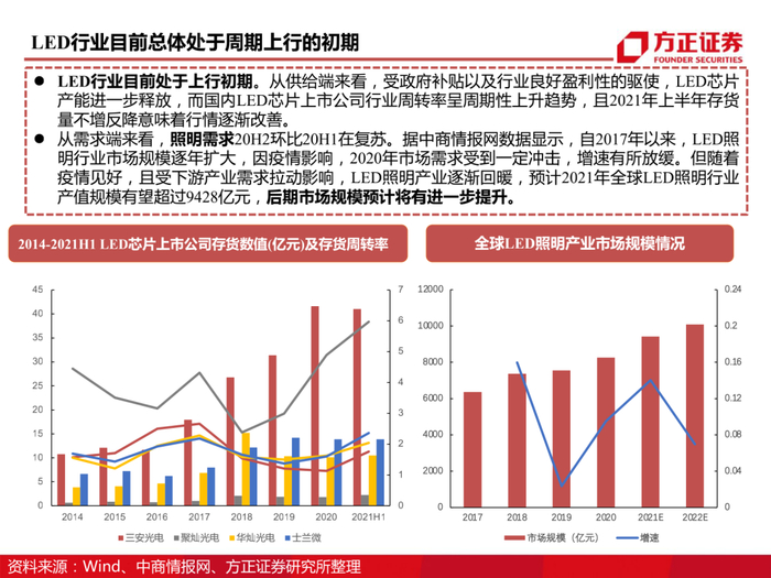 于2019年11月开启半导体产业化一期项目,扩张Mini/Micro LED芯片及封装产能,氮化镓Mini/Micro LED芯片161万片/年、砷化镓Mini/Micro LED芯片17.6万片/年。此外,公司积极开展与三星、TCL等龙头企业战略合作,持续加强技术能力。根据高工产业研究院(GGII)数据显示,2019年中国MiniLED市场规模在16亿元左右,2020年MiniLED市场规模预计达到37.8亿元,同比增长140%。前瞻产业研究院以此测算2026年中国MiniLED行业市场规模有望突破400亿元,增长空间超过10倍。我们认为下游需求爆发背景下,公司积极创新布局,行业龙头地位将进一步巩固且盈利能力将持续增强。