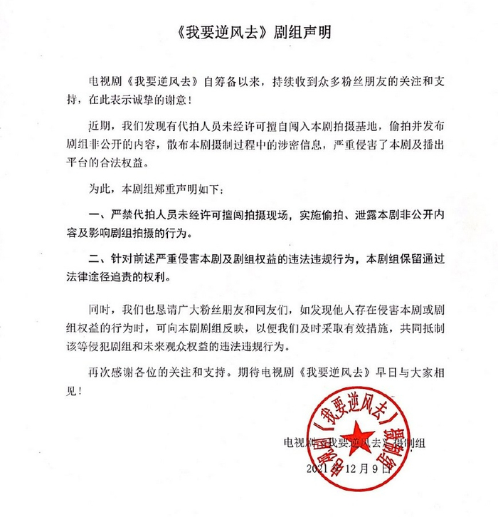 昨天,由龚俊、钟楚曦等演员主演的电视剧《我要逆风去》发布声明,称有代拍人员闯入拍摄基地偷拍并发布剧组非公开内容,强调严禁代拍人员擅闯现场,保留通过法律途径追责的权利。