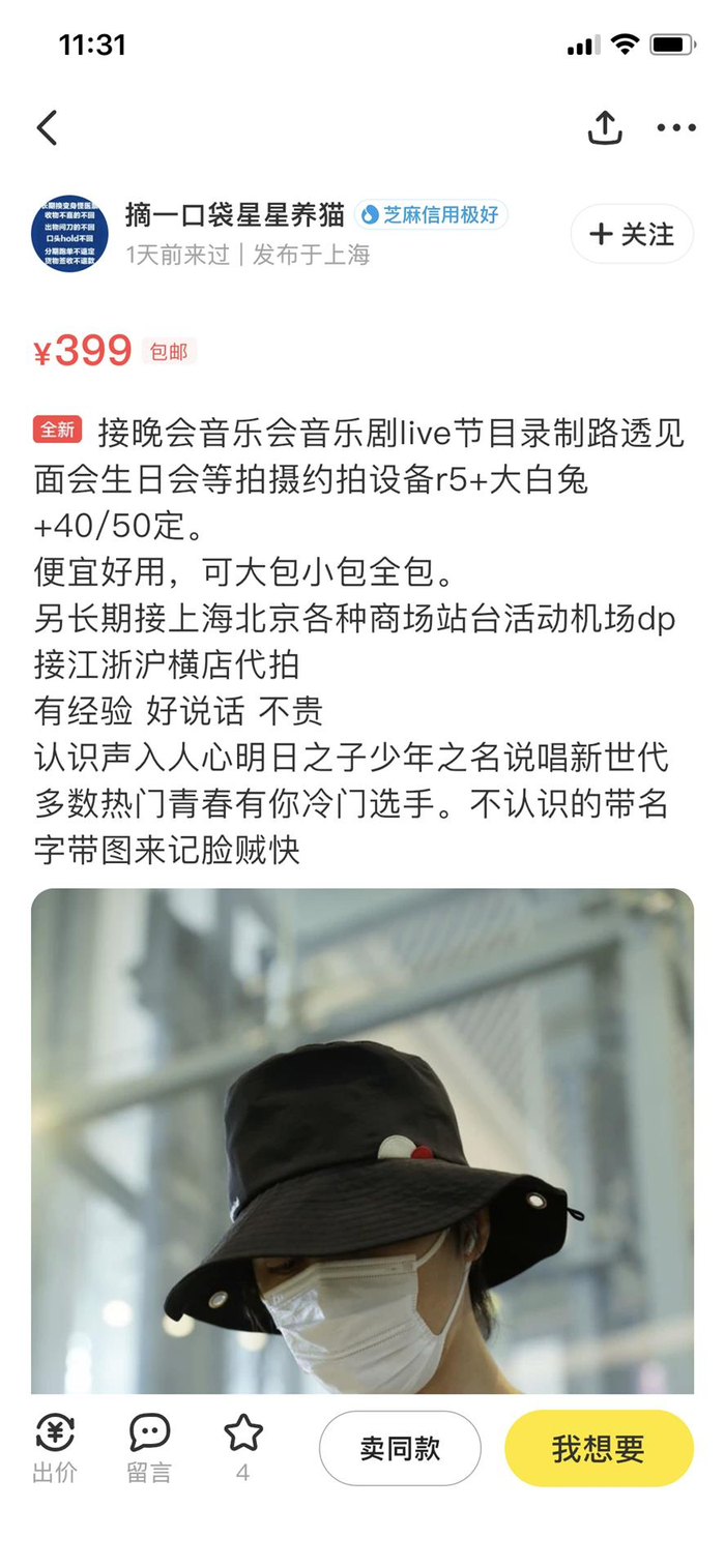“所谓‘代拍’,可以理解为‘代粉丝拍摄’,就是明星一些活动、拍摄,粉丝无法到场又希望获得照片,就由我们代拍。”从事过代拍行业的李先生介绍,“代拍”需要会躲藏能抢拍的能力,还得有一定的拍摄技巧,“我们做的是粉丝生意,拍得难看赚不到钱。”