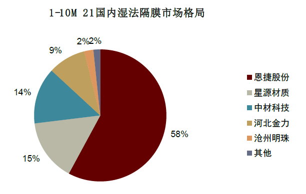 高行业壁垒铸就优异竞争格局,1-10M21国内湿法隔膜CR3高达87%;2020年干法隔膜CR3达62%。