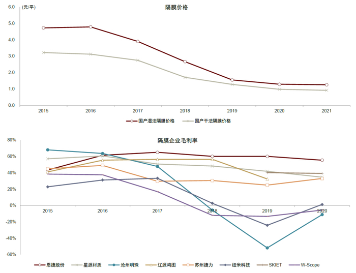 图表:2016年后隔膜价格持续下滑,隔膜企业毛利率出现明显分化(截至2021年11月)