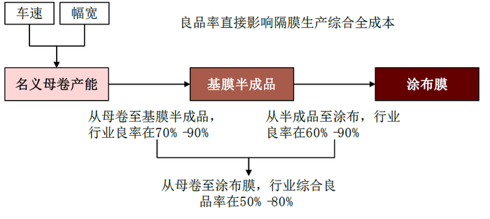 良品率直接影响隔膜生产综合全成本,企业间差异可达20%。隔膜从母卷制作成涂覆膜需经历一次分切-涂覆-二次分切等多个步骤,存在一定的分切收率与A品率影响最终实际出货。