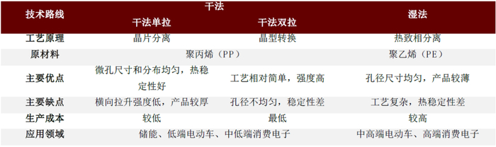 ►干法隔膜:原材料为聚丙烯(PP),产品热稳定性较好,生产工艺简单成本更低,但隔膜性能上相较湿法隔膜更差,且产品更厚不利于提高能量密度,通常应用于对成本要求更高的储能、低端电动车和低端消费电子等领域。