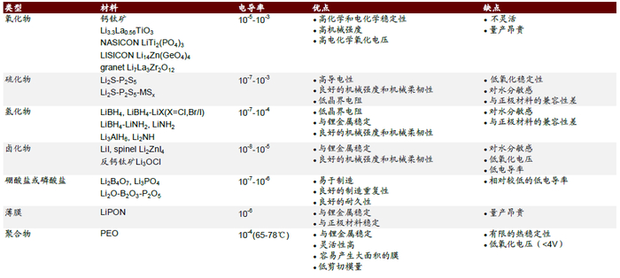 ►氧化物:包含 NASICON、Garnet 等几类无机氧化物,该体系特点为较高的电化学稳定性、机械强度、高窗口电压,整体的缺点在于界面问题突出,电导率相对较低,大部分体系柔性有限大幅提升电池制造的难度。