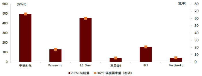 图表:2025年海外锂电龙头企业隔膜需求量可达60亿平+